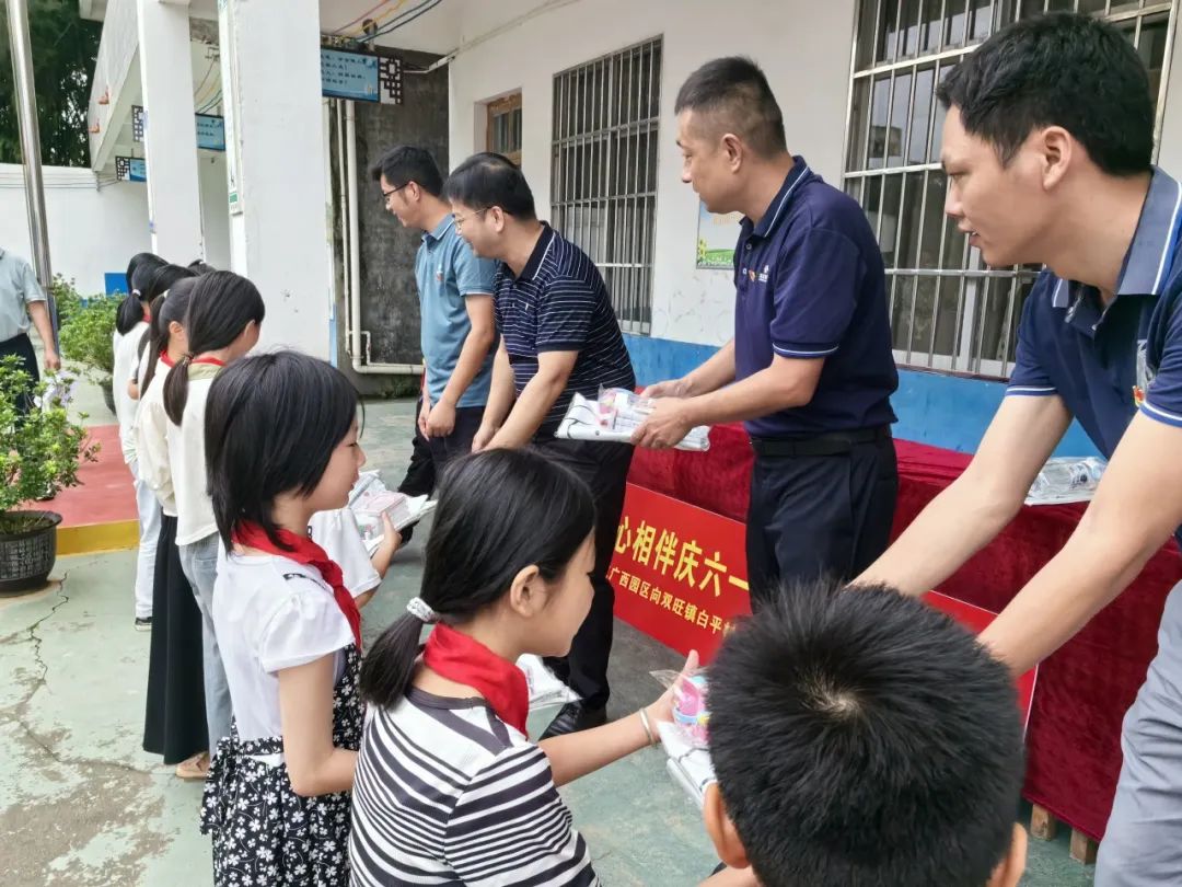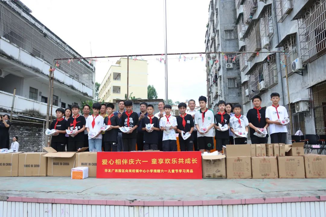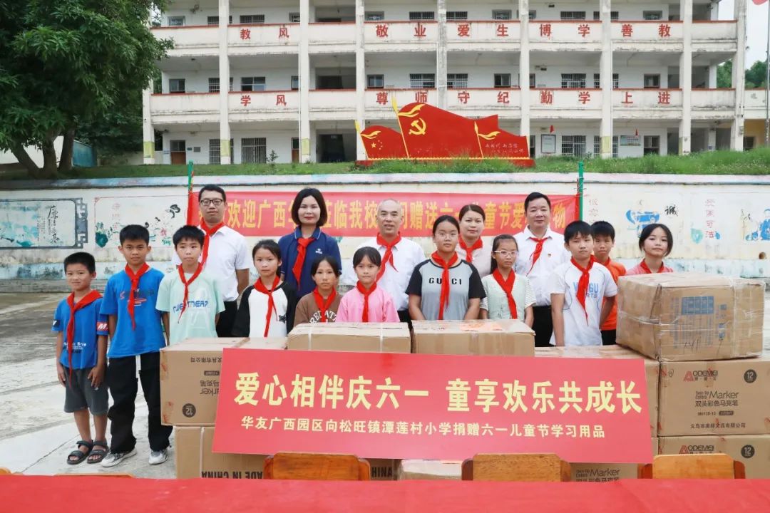 “不管在哪里投資,都要為當(dāng)?shù)亟?jīng)濟(jì)社會(huì)做貢獻(xiàn)”的投資理念,改善鄉(xiāng)村兒童學(xué)習(xí)生活環(huán)境,履行企業(yè)的社會(huì)責(zé)任,助力形成全社會(huì)關(guān)心和參與愛心助學(xué)的氛圍,5月29日上午,華友廣西園區(qū)到周邊的松旺鎮(zhèn)潭蓮村,雙旺鎮(zhèn)白平村、邦杰村、曾村和中心小學(xué)等5所小學(xué)走訪慰問,廣西區(qū)域管理中心及各產(chǎn)業(yè)集團(tuán)廣西基地干部代表為5所小學(xué)3700多名學(xué)生送上書包、水杯、馬克筆和筆記本等學(xué)習(xí)用品作為兒童節(jié)禮物。