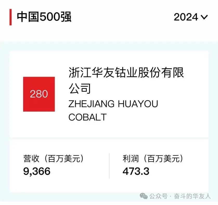 《財富》中國500強,華友鈷業(yè)位居第280位!