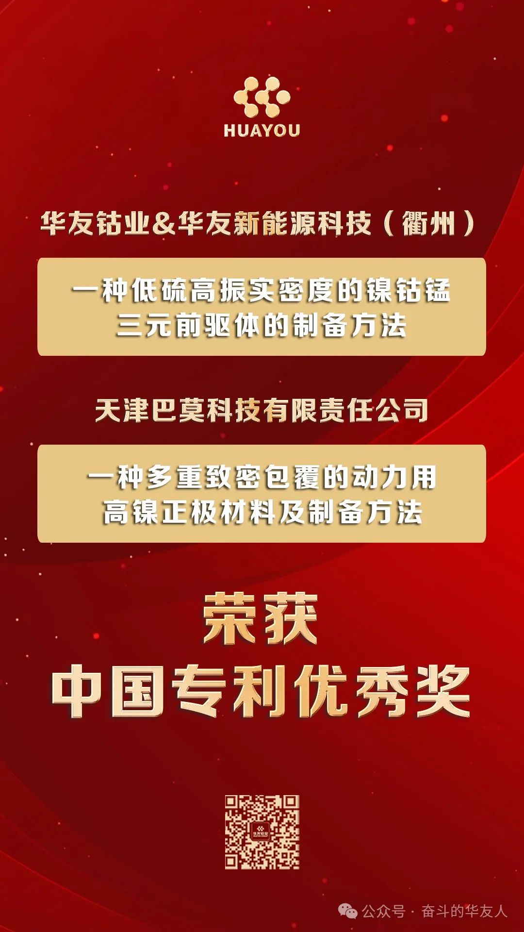 近日,國家知識產權局發布了《第二十五屆中國專利獎評審結果公示》,華友鈷業、華友新能源科技(衢州)有限公司申報的“一種低硫高振實密度的鎳鈷錳三元前驅體的制備方法”及旗下子公司天津巴莫科技有限責任公司申報的“一種多重致密包覆的動力用高鎳正極材料及制備方法”發明專利榮獲中國專利優秀獎。