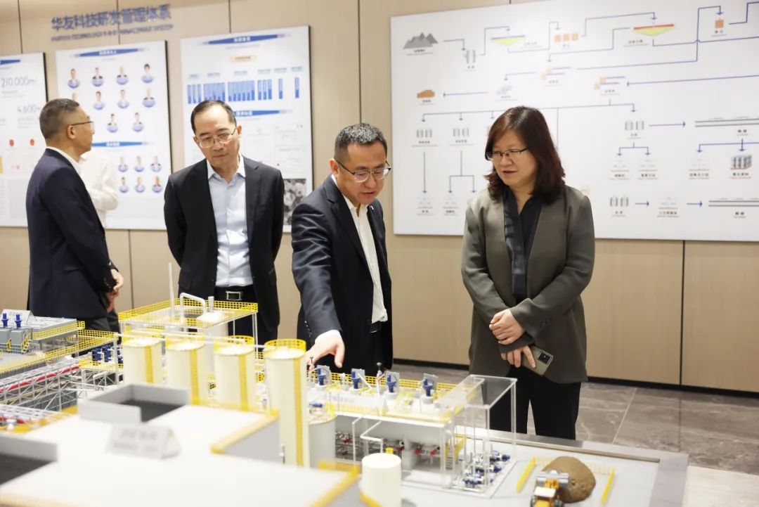 胡柯副主席一行首先步入文體中心。這里設施一應俱全,從游泳池到各類球館,全方位滿足職工的精神文化與體育鍛煉需求,彰顯出企業對職工身心健康的深切關懷。緊接著,調研團移步美食街,深入了解職工的業余生活配套狀況。從美食街豐富多樣的餐飲選擇,到配套的電影院等休閑場所,展現出園區對職工生活品質提升的高度重視。在公司展廳,胡柯副主席了解了華友的歷史沿革、產業布局、產品應用領域及未來發展戰略規劃。深入探究華友衢州產業園黨建工作的豐碩成果,黨工團活動的開展情況,對工會在職工關懷、組織建設等方面的一系列創新舉措和顯著成績給予了高度肯定。