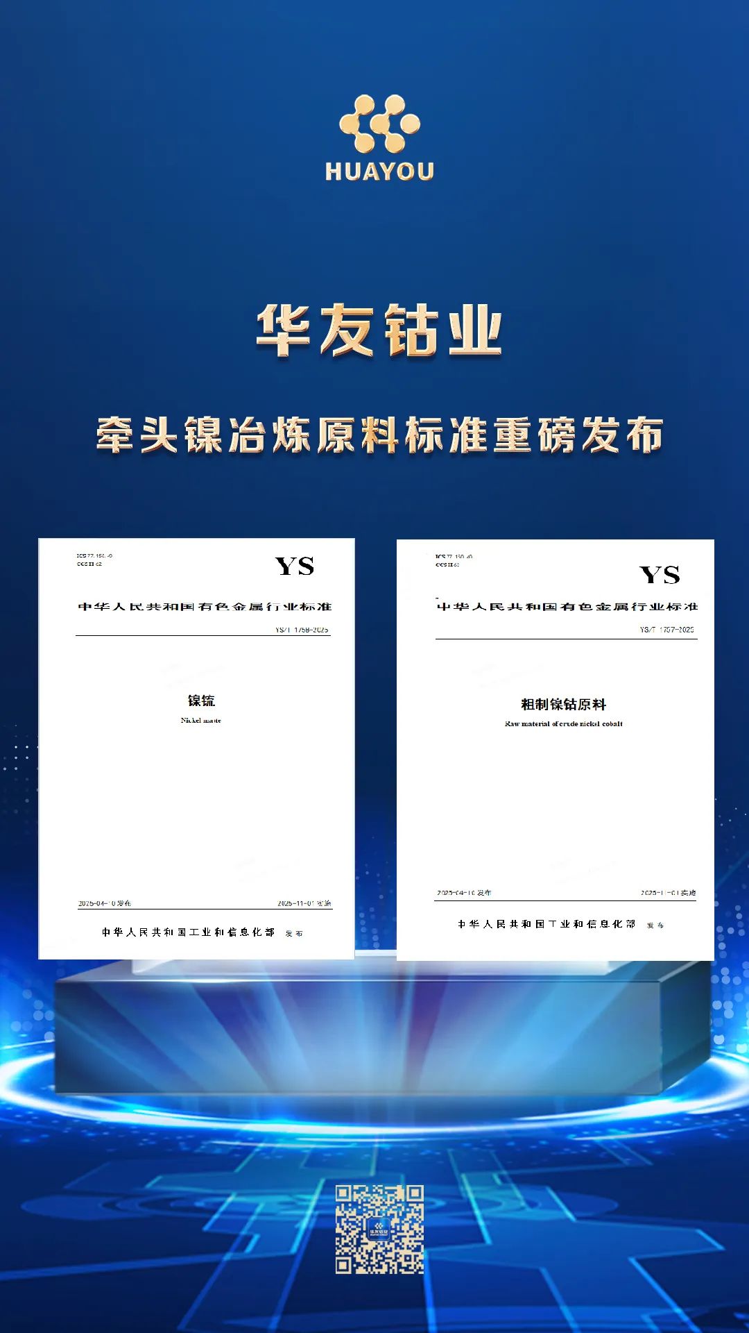 近日,中華人民共和國工業和信息化部批準發布了YS/T 1757-2025《粗制鎳鈷原料》、YS/T 1758-2025 《鎳锍》標準。兩項標準均由衢州華友鈷新材料有限公司牽頭制定,進一步完善了中國鎳冶煉中間品領域的標準體系,為中國鎳資源的進口提供了切實可靠的依據,保障中國關鍵礦產資源的供應。