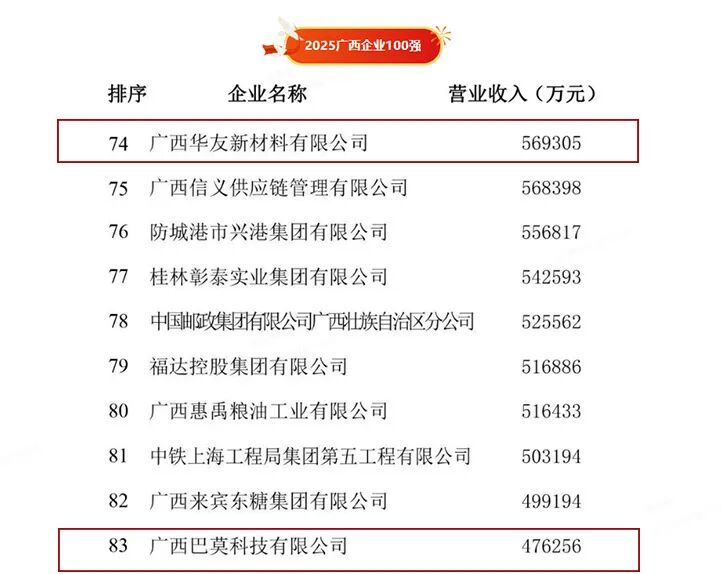 此次榜單中,在代表廣西企業綜合實力的最高榮譽“廣西企業100強”中,廣西華友新材料有限公司居第74位;廣西巴莫科技有限公司位列第83位。兩家企業攜手闖入全區百強企業陣營,標志著華友廣西園區已具備顯著綜合競爭力。