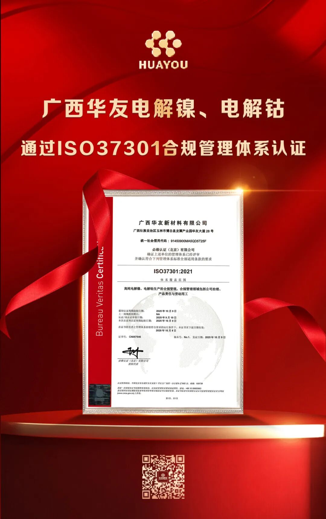 近日,華友鈷業旗下廣西華友新材料有限公司正式獲得國際權威認證機構頒發的ISO 37301合規管理體系認證證書,為華友國際化戰略奠定了堅實的合規基礎。