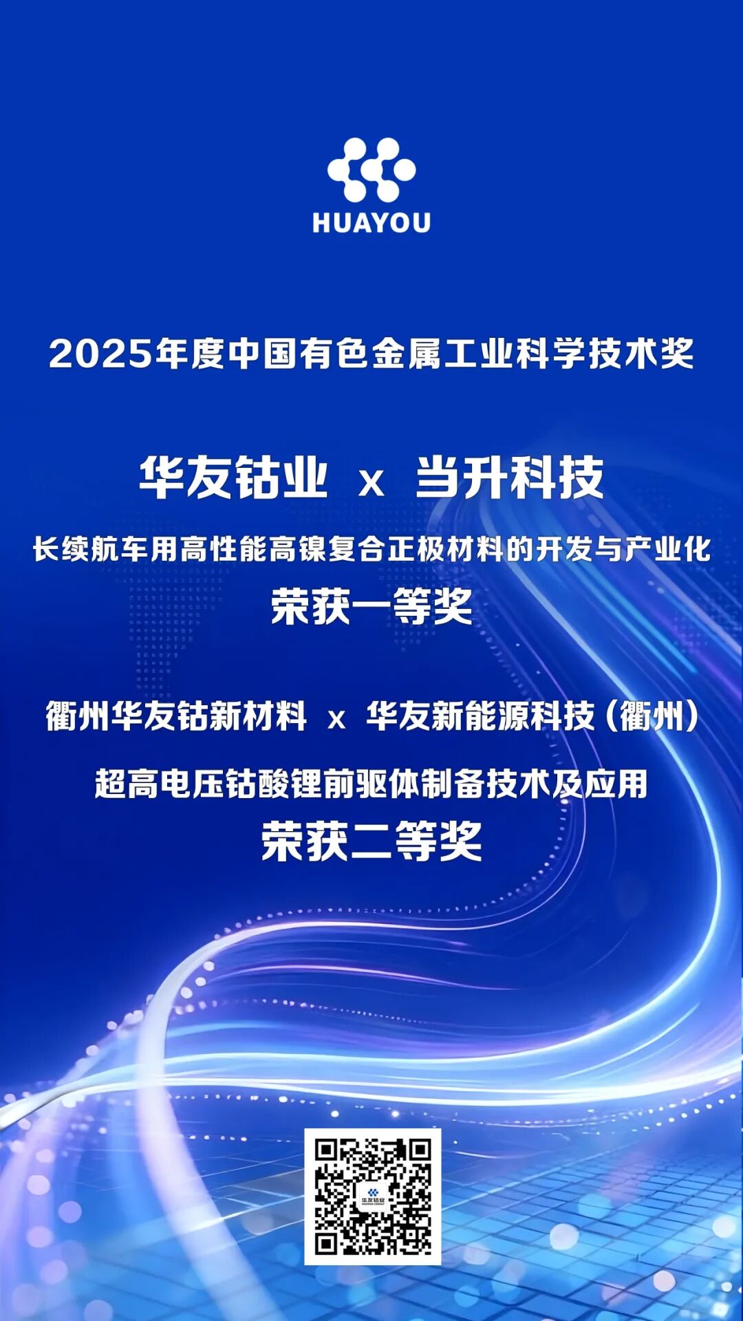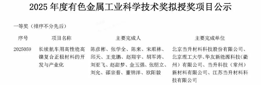 近日,2025年度中國有色金屬工業科學技術獎獲獎名單揭曉,華友鈷業憑借兩大核心產品的技術突破與產業化深耕,斬獲兩大獎項。其中,華友鈷業與北京當升材料科技股份有限公司聯合攻關的“長續航車用高性能高鎳復合正極材料的開發與產業化”項目,榮登一等獎榜單;由衢州華友鈷新材料有限公司牽頭,華友新能源科技 (衢州) 有限公司深度參與的“超高電壓鈷酸鋰前驅體制備技術及應用”項目,斬獲二等獎。