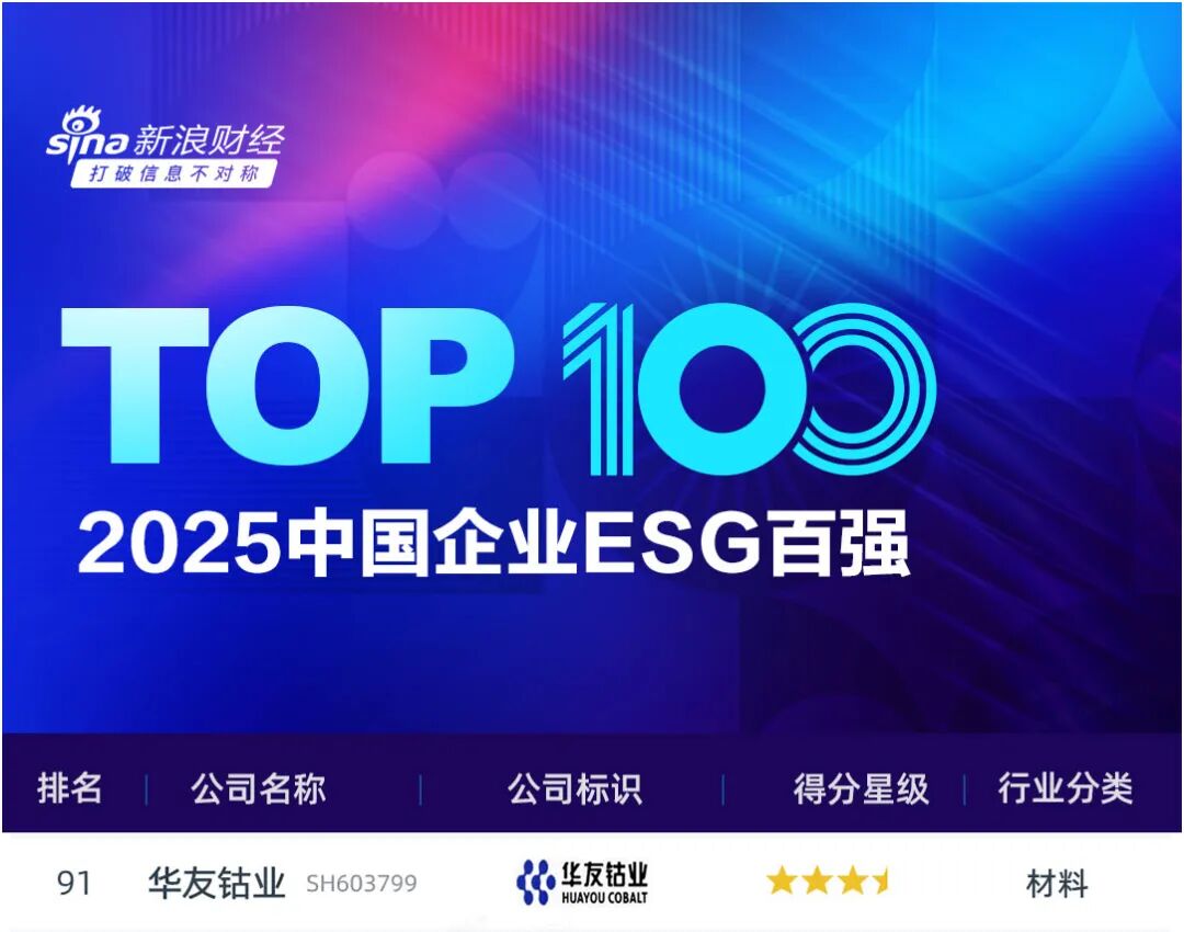 近日,新浪財經發布“2025中國企業ESG百強”榜單,華友鈷業憑借在環境(E)、社會(S)、公司治理(G)的出色表現,成功從5000余家A股上市公司及在港上市內地企業中脫穎而出,入選該榜單,位列第91位。此次入選不僅彰顯了權威機構對華友鈷業可持續發展實踐的高度認可,更確立了華友作為新能源行業ESG標桿企業的領先地位。