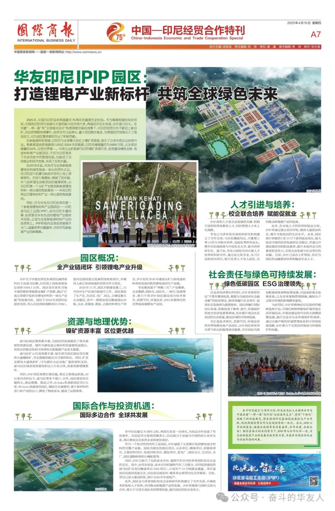 今年是中國(guó)與印尼建交75周年,《國(guó)際商報(bào)》策劃了中國(guó)—印尼經(jīng)貿(mào)合作特刊。4月10日,《國(guó)際商報(bào)》刊發(fā)了《華友印尼IPIP園區(qū):打造全球鋰電產(chǎn)業(yè)新標(biāo)桿,共筑綠色未來》重磅報(bào)道,深度展示華友在推動(dòng)印尼產(chǎn)業(yè)升級(jí),促進(jìn)兩國(guó)經(jīng)貿(mào)合作與區(qū)域經(jīng)濟(jì)繁榮發(fā)展等方面所作的貢獻(xiàn)。